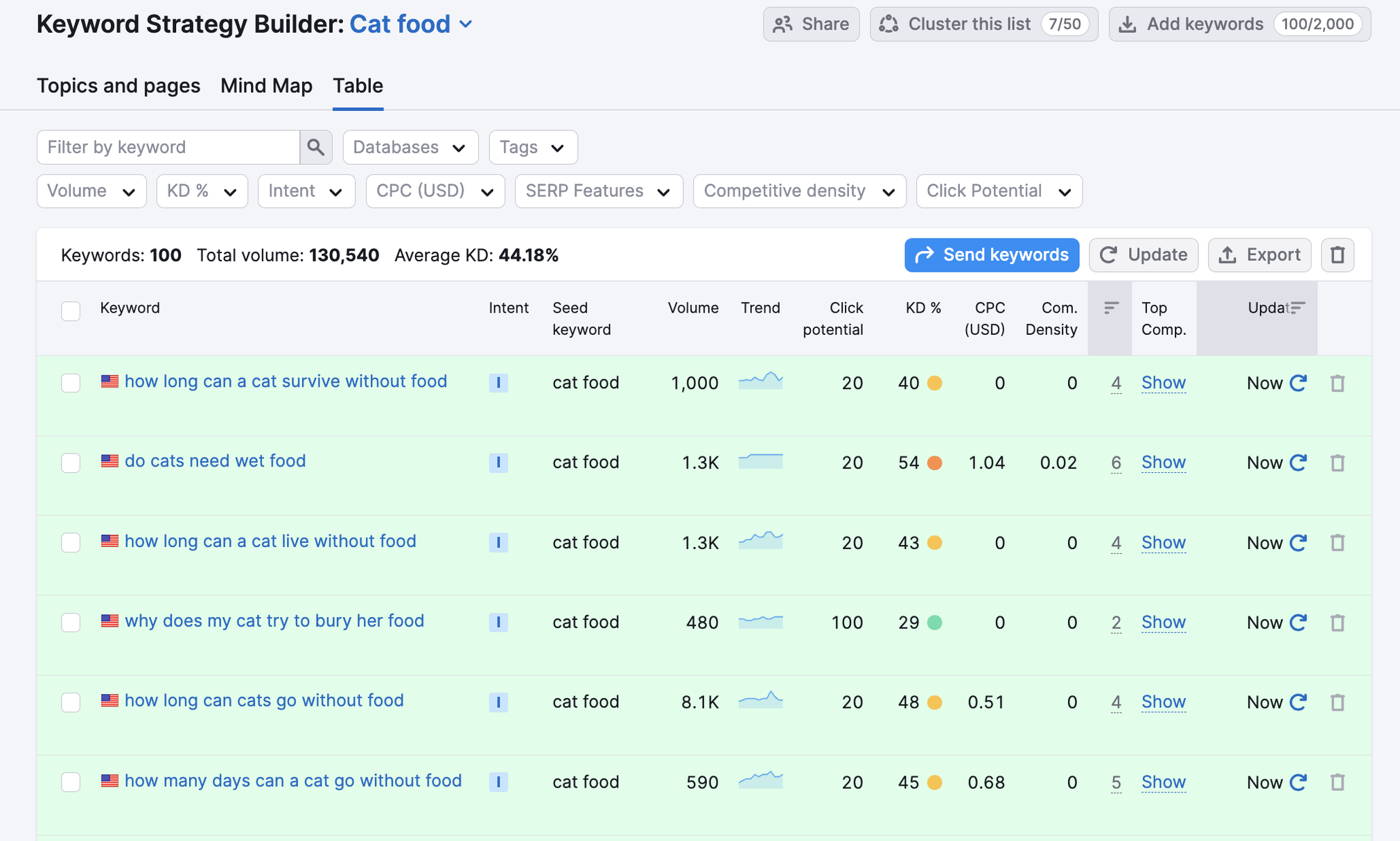 You’ll also see a column titled KD% in any Semrush report that has keywords. You can filter or sort these columns to find your best opportunities.