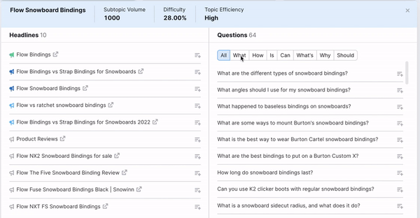 You can expand each card to hone in on related questions, top headlines, and even filter to look for ideas from a specific competitor’s domain. For all of the in-depth ways to use Topic Research, read this article.