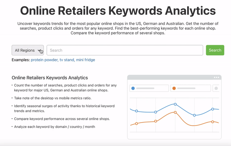 Together, they allow you to run deep analyses on keywords across over 130 online retailers, including major US retailers like Amazon, Best Buy, Ebay, Lowe, and Etsy, German retailers like Amazon.de, Idealo, OTTO, and Zalando, Australian retailers like Bunnings, and Kmart. In addition, French retailers like Auchan and Fnac are also included, among others, and the coverage is not limited to these countries alone.