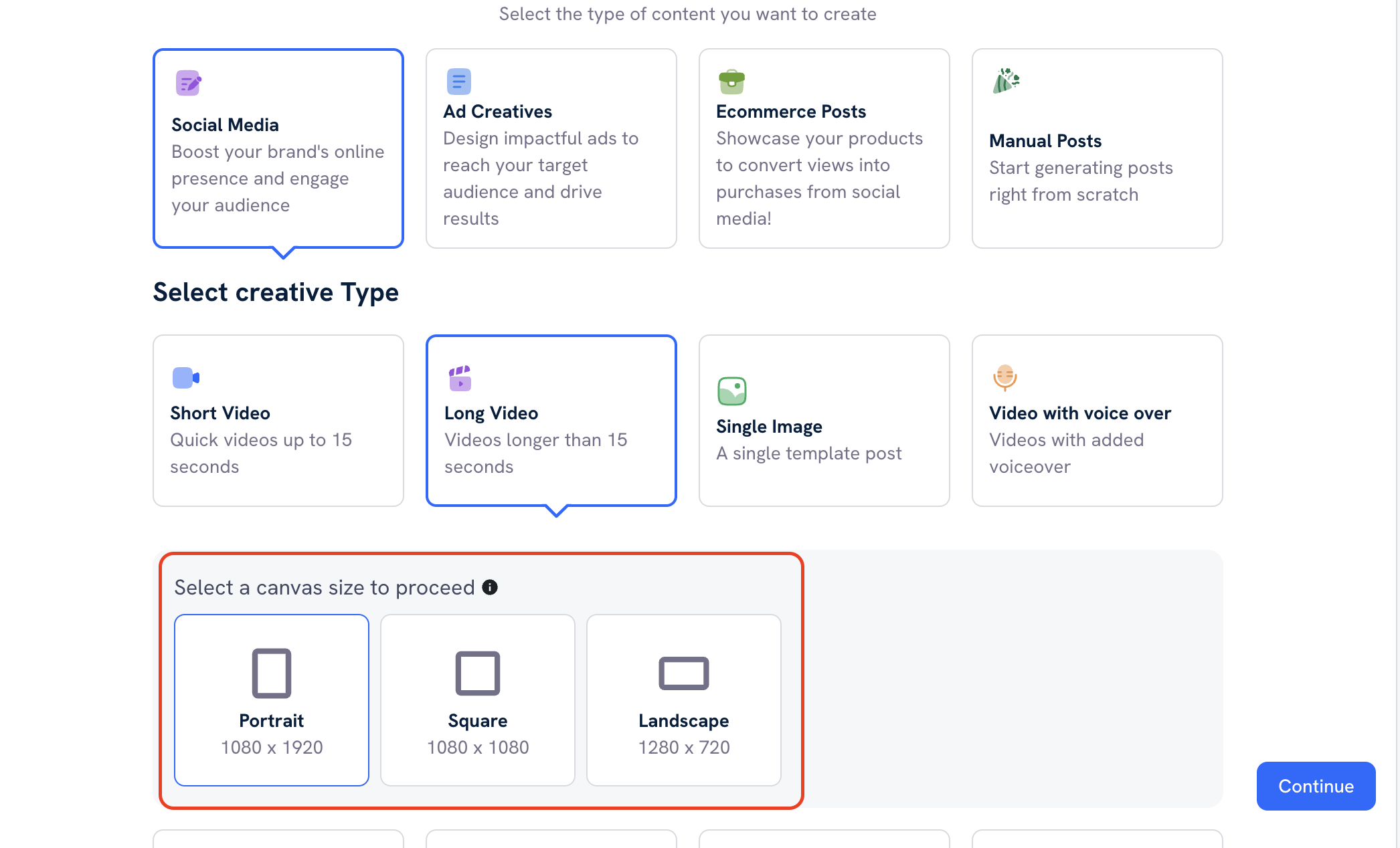 Within each category, you will find a creative type to help you get started, including short videos, carousels and quotes. Select your type of creative and, if necessary, the format(s) required and click ‘Continue’ to proceed.