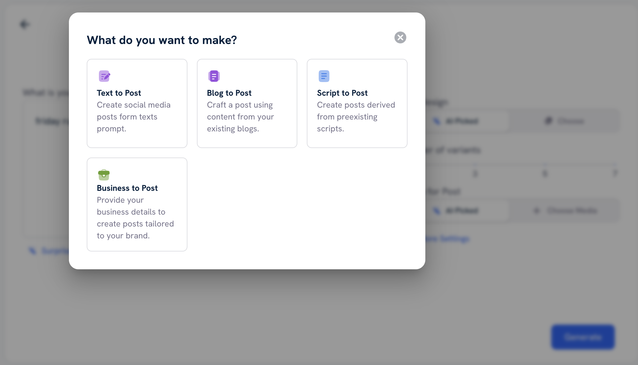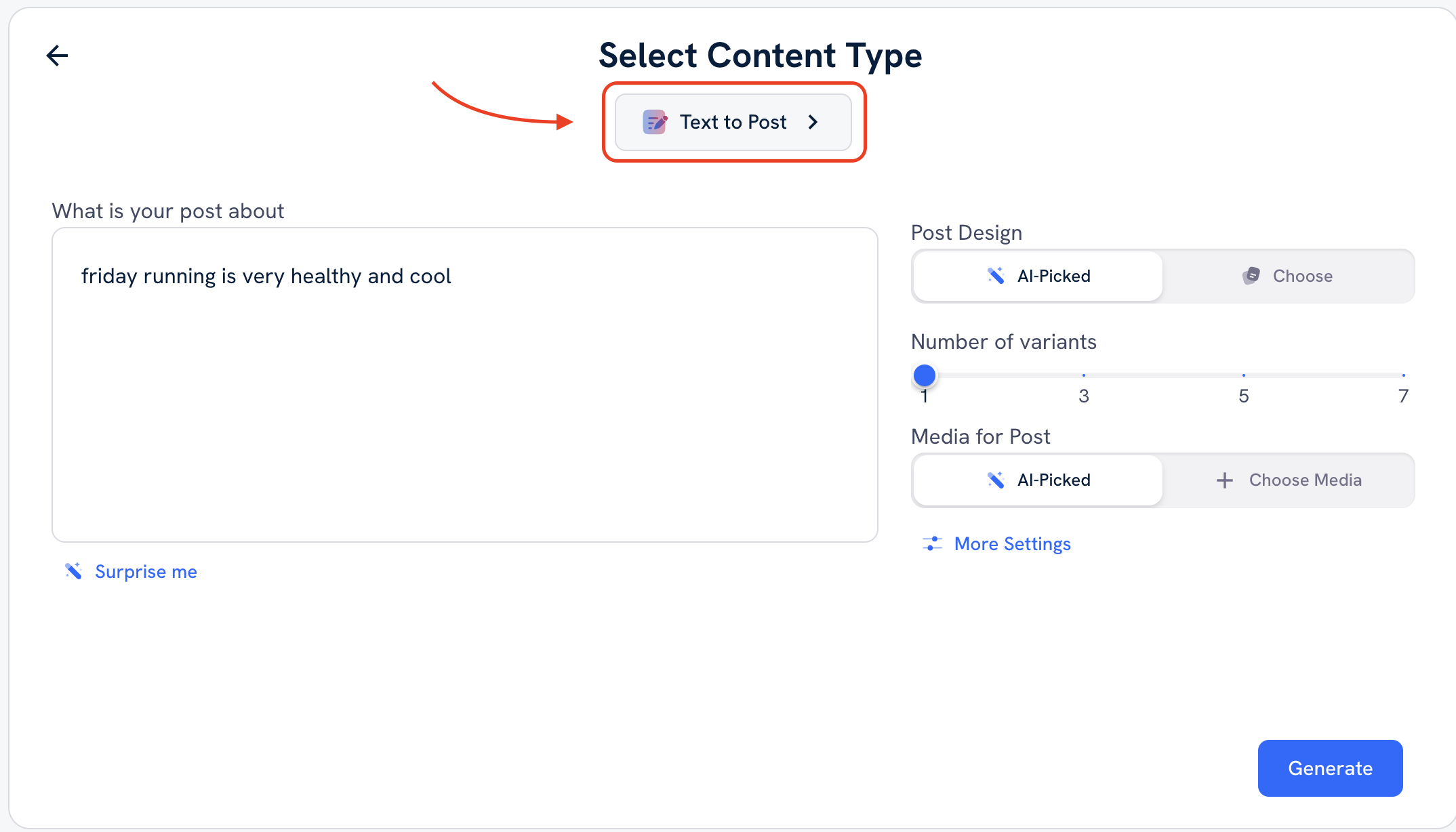 Select your post type (AI-Picked, Image, Video, Carousel) and choose the Post Design, Number of Variants, Aspect ratio, and Media for Post.