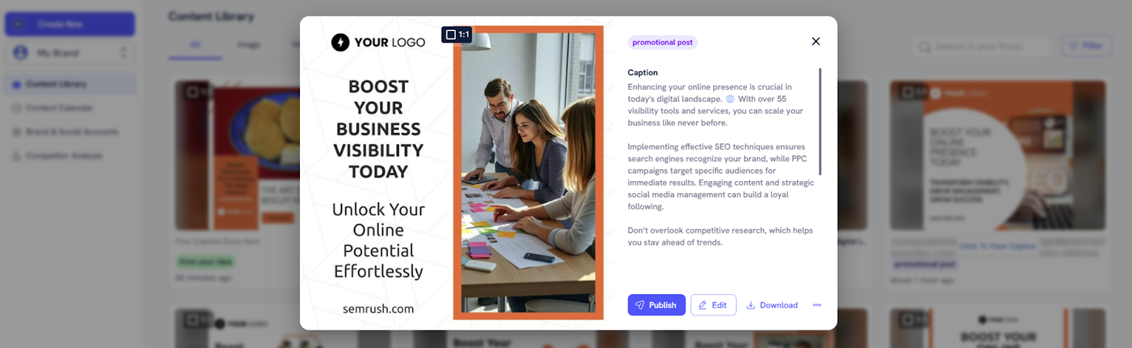 The Content Library page is where you can find all the content you’ve created for your brand.