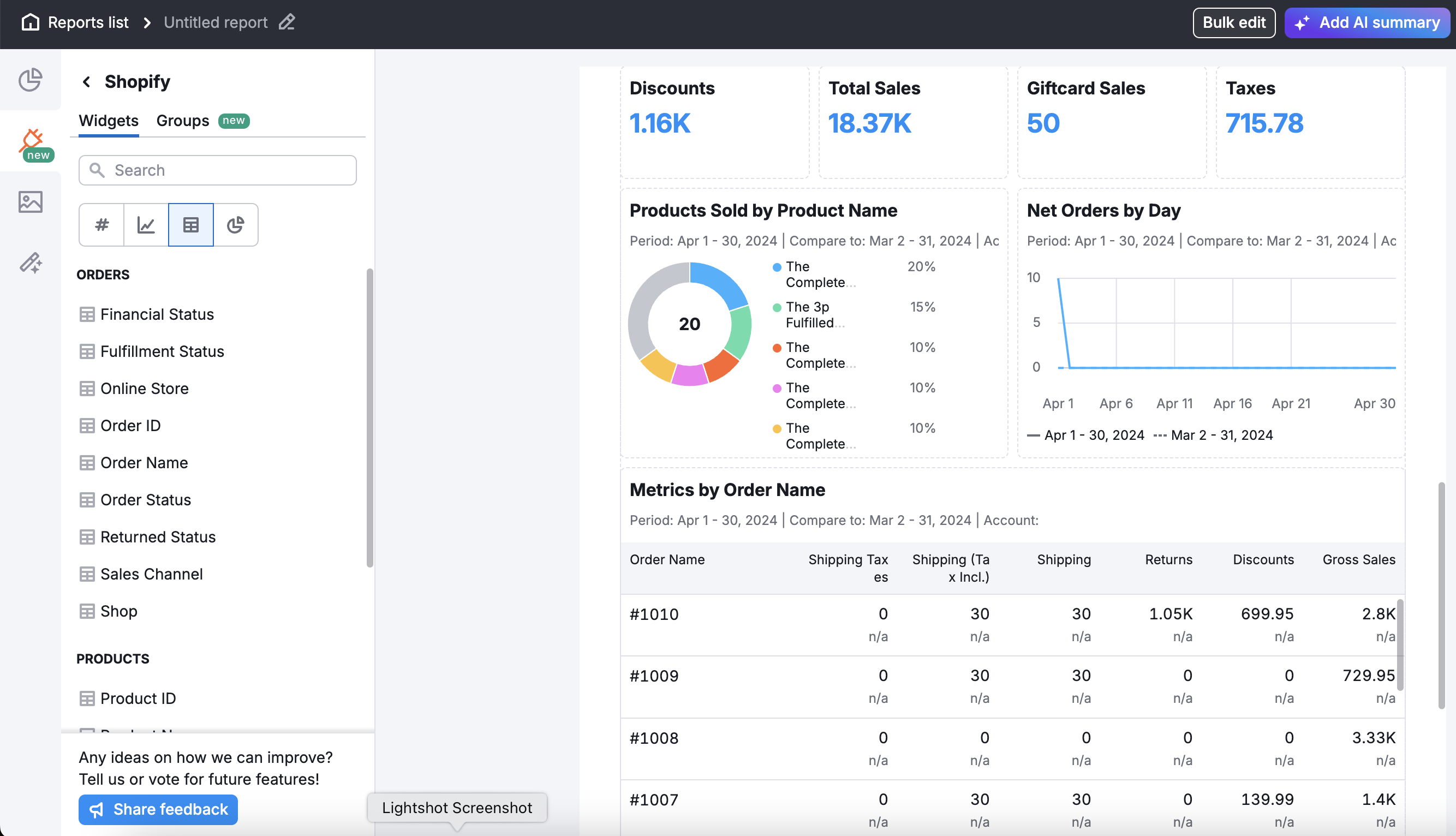 Also, Groups are available in the Integrations. With Groups, you can add several widgets with one click, grouped by product task or business area. Widget Groups make the report creation less time-consuming and simplify the flow of creating a report from scratch.